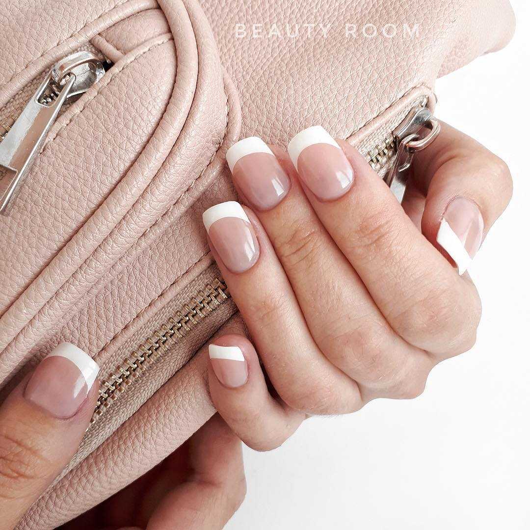 1)Классический белый: как уже было описано выше, сам ноготь покрывается нежно-розовым или бежевым лаком, а кончик ногтя – белым. Это скромный вариант, подойдет для любительниц естественного вида ногтей, а также для тех леди, образ жизни которых требует соблюдения дресс-кода.