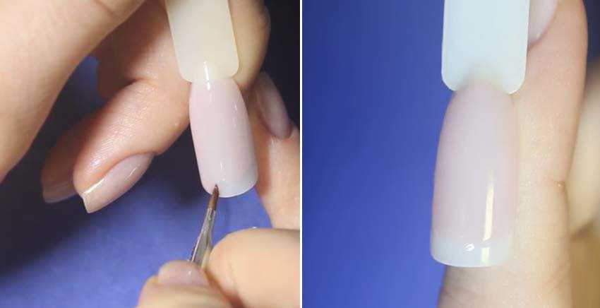 - Особой плоской кистью наносится гель. Если наращивают френч, то для кончика используется гель, отличный по цвету от остального ногтя.