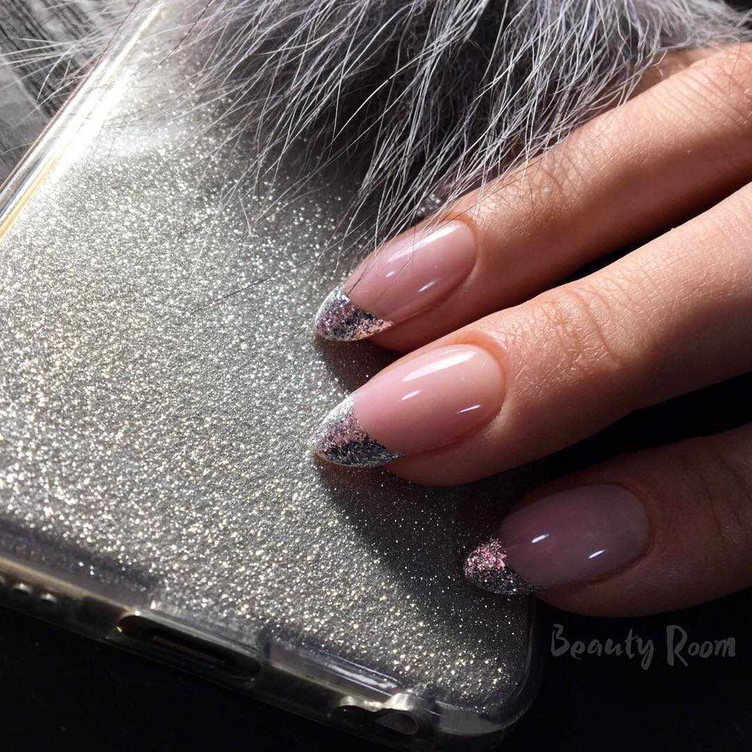 3) Праздничный вариант: на основание ногтевой пластины наносится все тот же розовый или бежевый лак (мастера маникюра называют его «камуфляж»), а края ногтей украшаются блёстками, стразами или фольгой. Этот вариант подойдет для ярких модниц, для похода на день рождения, в клуб. Он будет блистать, играть на свету различными оттенками так, что невозможно оторвать глаз.