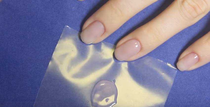 Используют подручный материал, как и покупные полоски, наклеивая на ногти, отступая от края. Затем наносят шеллак, сушат в лампе. После просушки удаляют скотч и покрывают ногти слоем финиша.