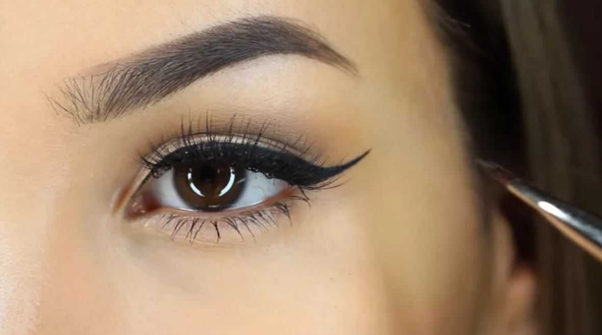 - Вооружившись черным лайнером или карандашом, подчеркните верхнее веко тонкой линией и аккуратной стрелкой.