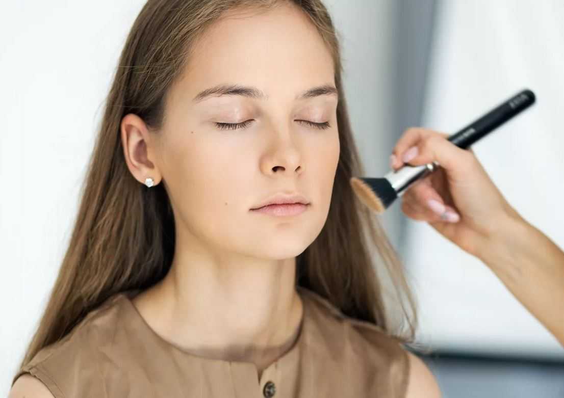 - В завершении вечернего макияжа наносим на лицо тонкий слой прозрачной матирующей пудры, чтобы закрепить контуринг. Также можно использовать на щеках немного румян.