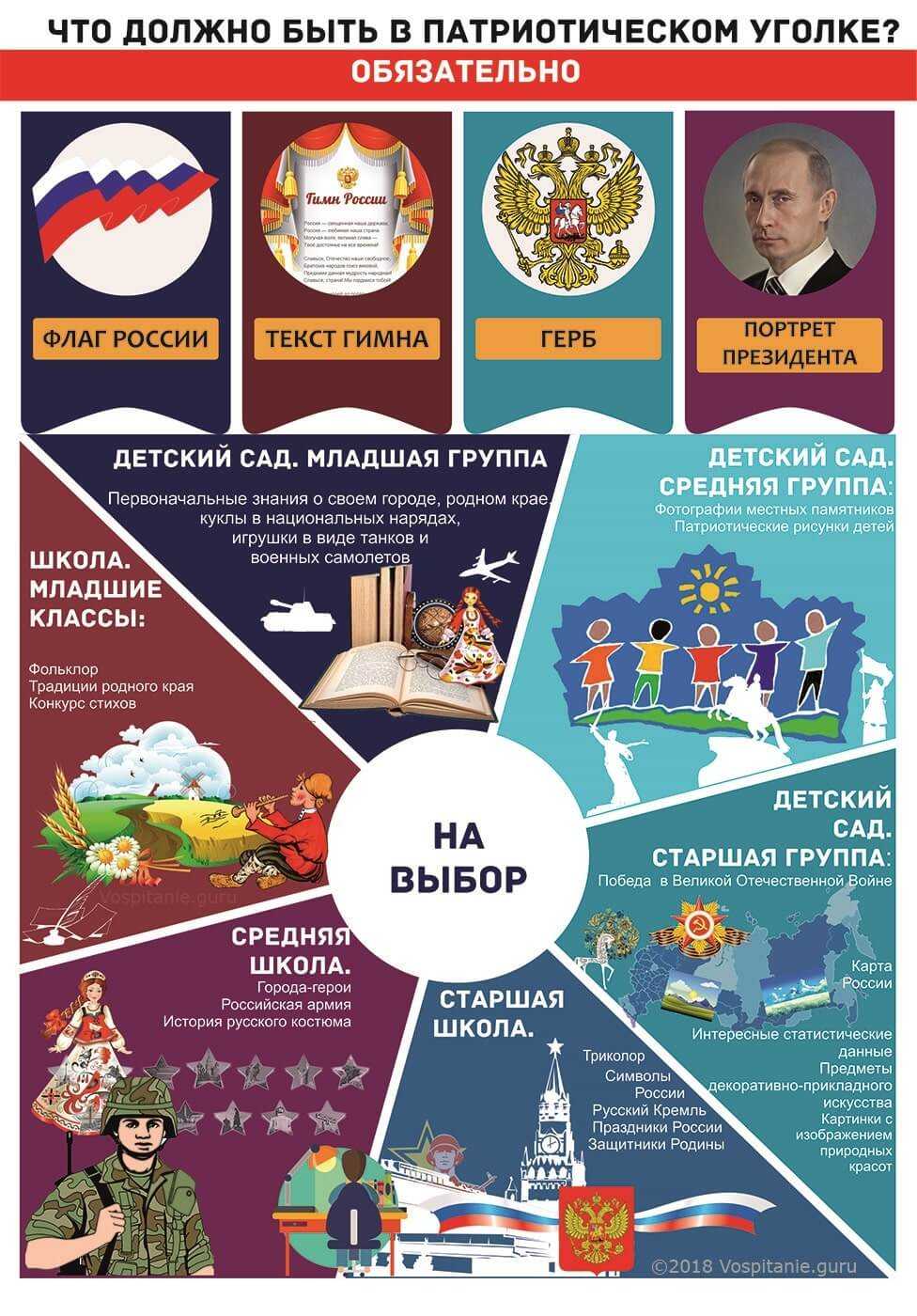 К обязательной информации в уголке патриотизма в начальных классах относится главная государственная символика ― гимн страны, герб и флаг. Дополнительно может присутствовать портрет президента, символика региона. Также следуют позаботиться о том, чтобы дети могли слушать музыкальный вариант гимна.
