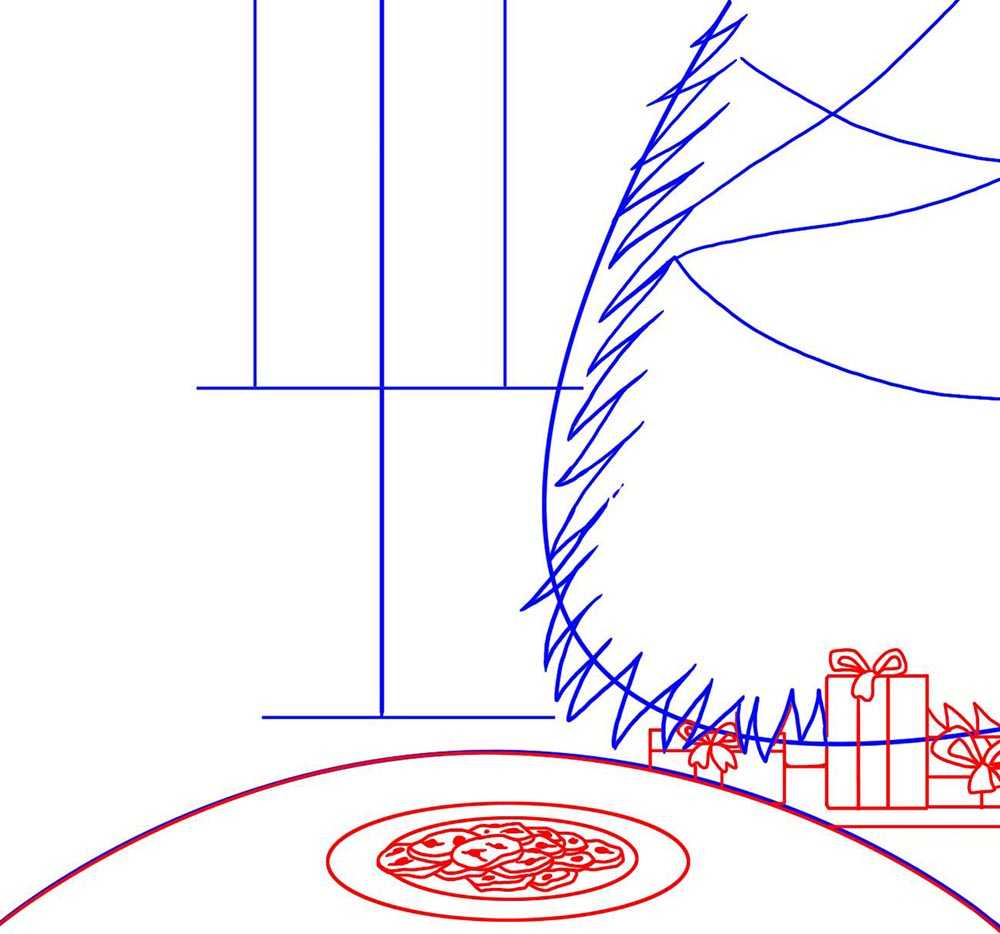 Шаг 3 Сделаем более толстой линию стола, а затем нарисуем на нем тарелку с печеньем. Теперь нарисуем под елкой рождественские подарки в красивой обертке с бантами.