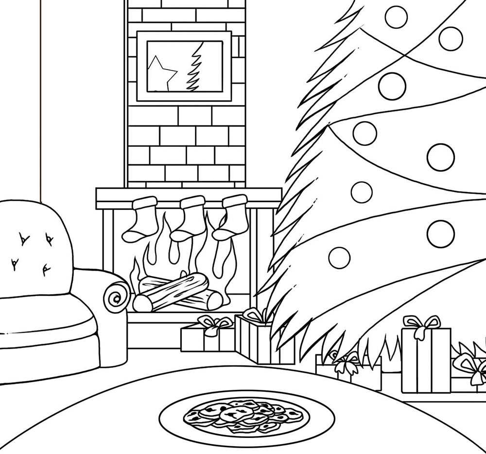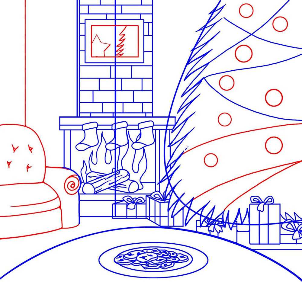 Шаг 5 Теперь нарисуем праздничную картину на камине. У камина нарисуем кресло. Украсим елку игрушками и гирляндами и удалим вспомогательные линии.