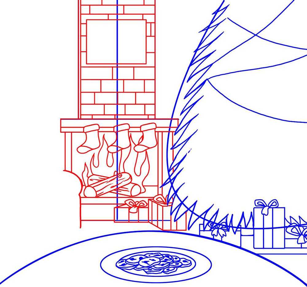 Шаг 4 Оформим камин кирпичами, а затем нарисуем рождественские носки, подвешенные на край камина. Нарисуем в камине бревна и пламя и добавим еще пару подарков.