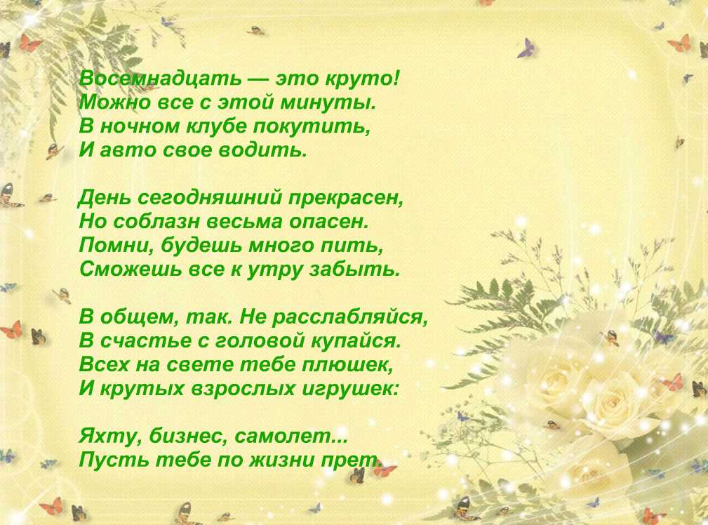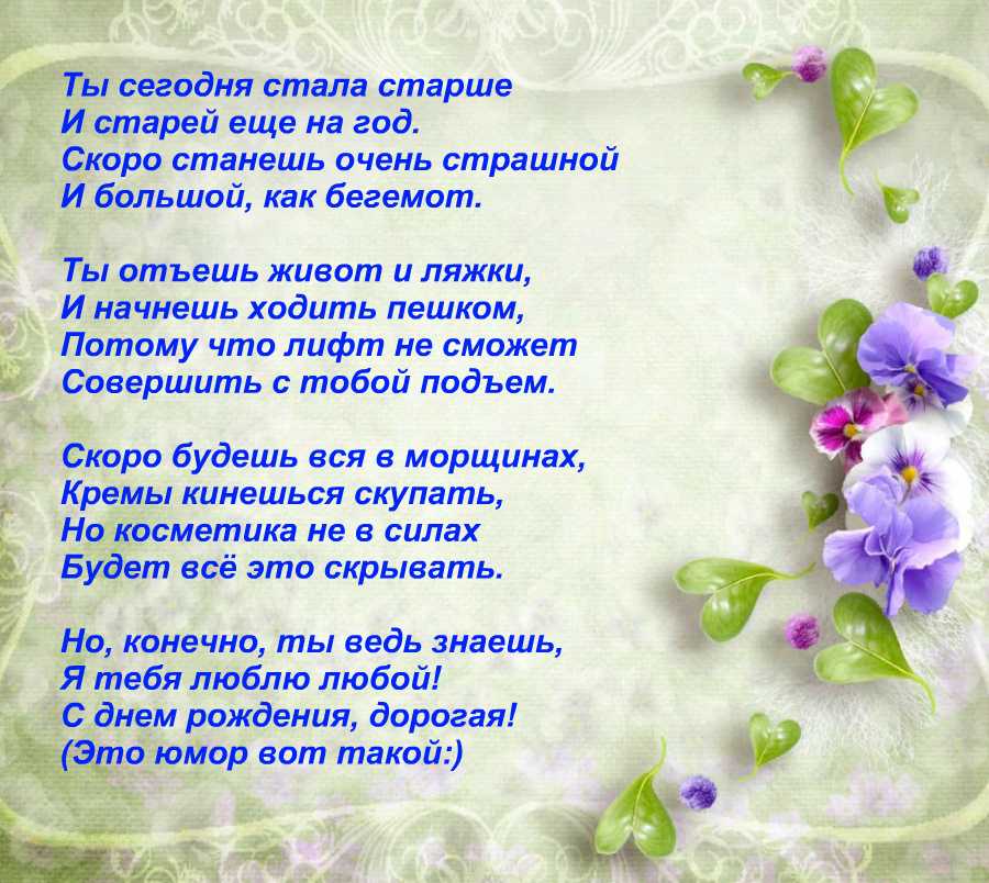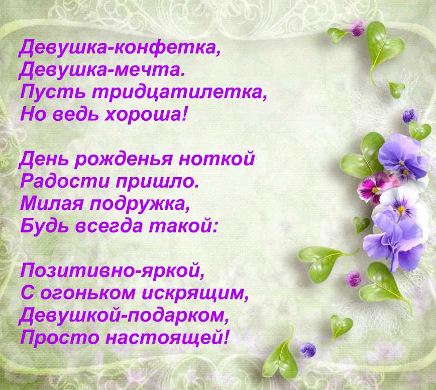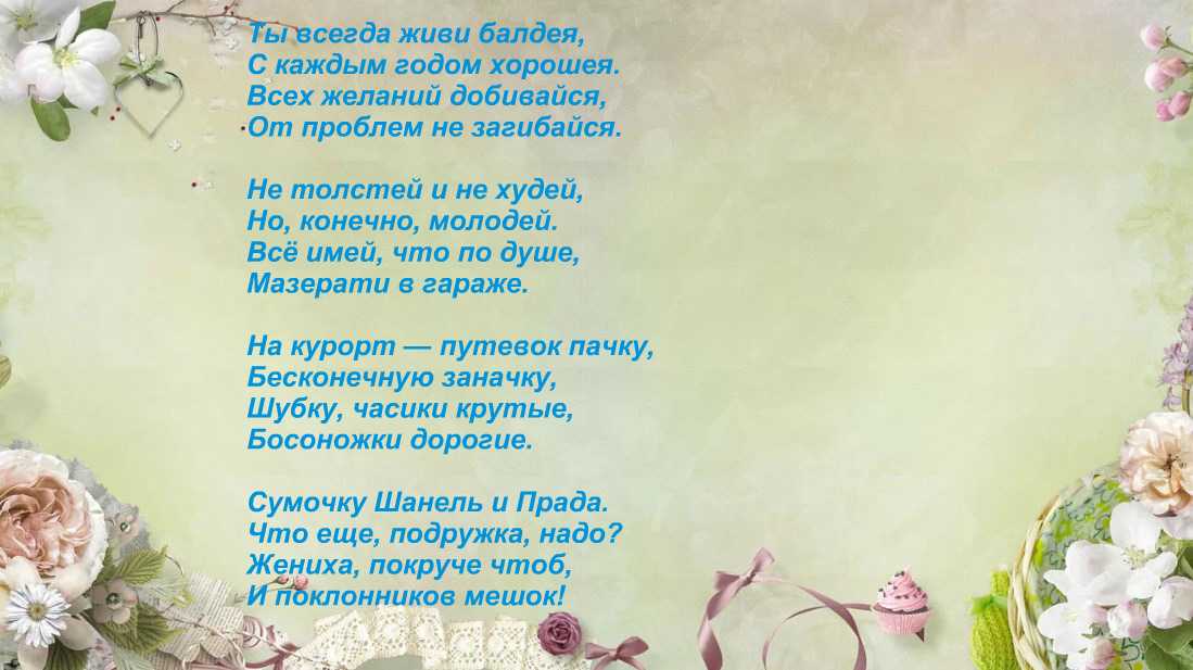 Ты подруга верная, Девочка примерная, Поздравляю с днем рожденья, Будь такой без измененья. Если будешь ты меняться Не забудь собой остаться!