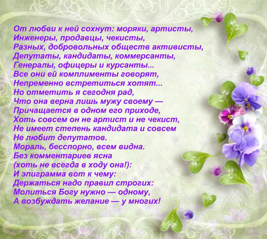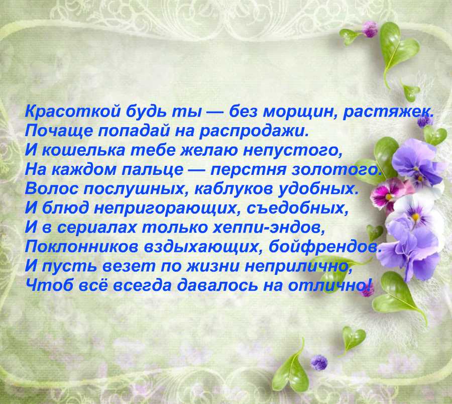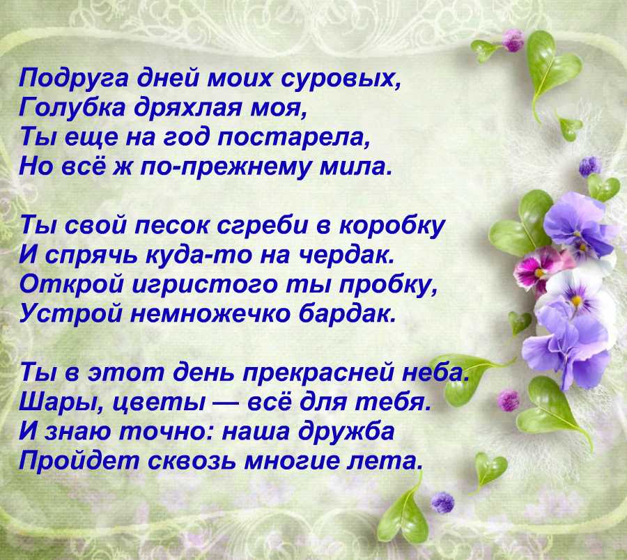 Подруге юной в День рожденья Желаю музы, вдохновенья, Не ведать горьких потрясений И от любви не знать мучений!