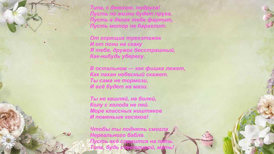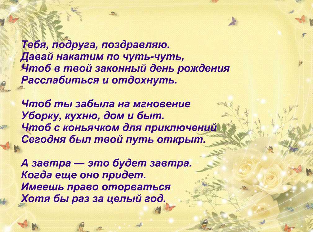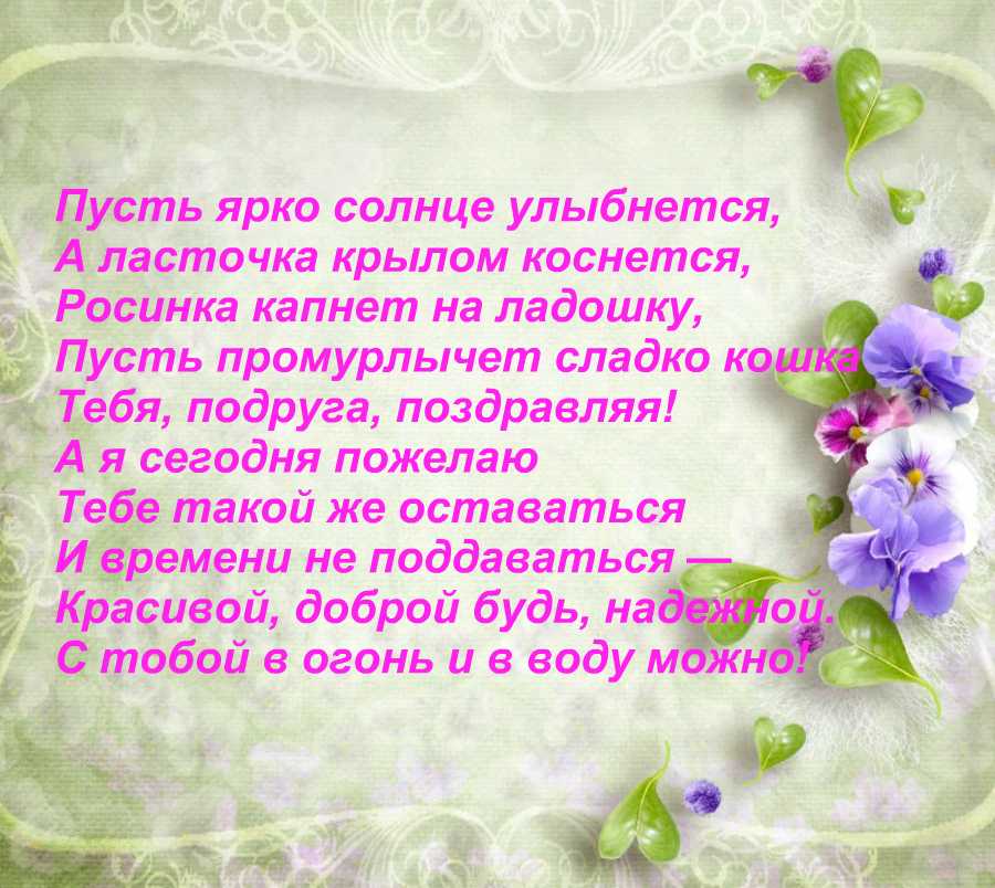 Летите строчки поздравлений, Подружка, я люблю тебя! Я поздравляю с днем рожденья, Счастья тебе, уюта и тепла!