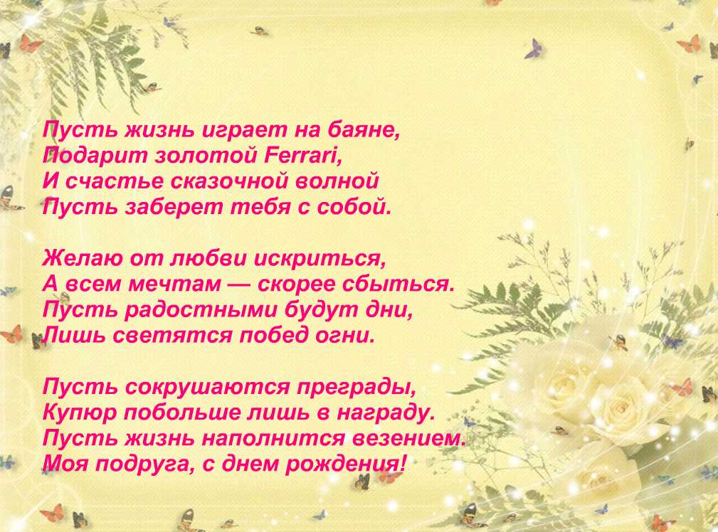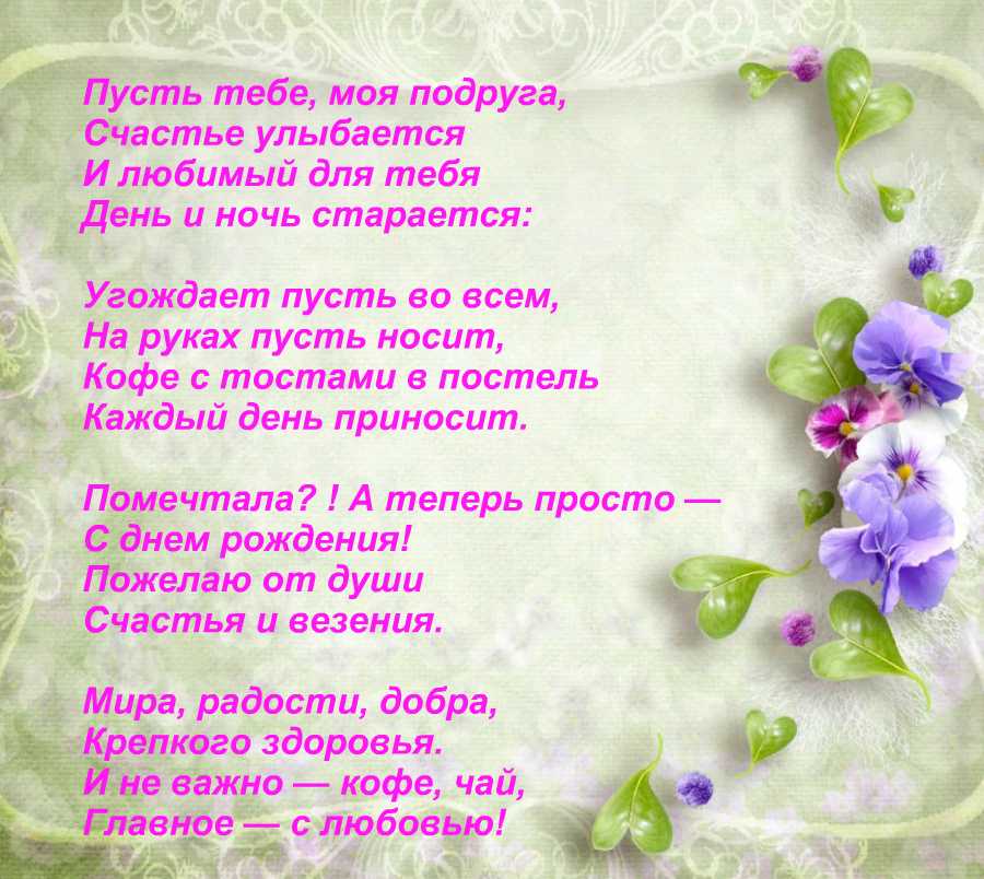 С днем рожденья, подружка моя! Пусть проблемы исчезнут разом, Расцветет жизнь цветком прекрасным, Пусть все сбудется, как по заказу!
