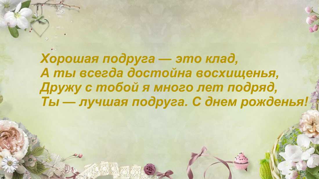 Подружка, помни правило простое, Чтоб радость каждый день тебе сулил, Люби лишь тех, кто этого достоин, А на других не трать душевных сил С днем рождения, сияй всегда, цвети, Купайся в роскоши, достатке и любви. Желаю много ярких и успешных дней, И рядом добрых, замечательных людей.