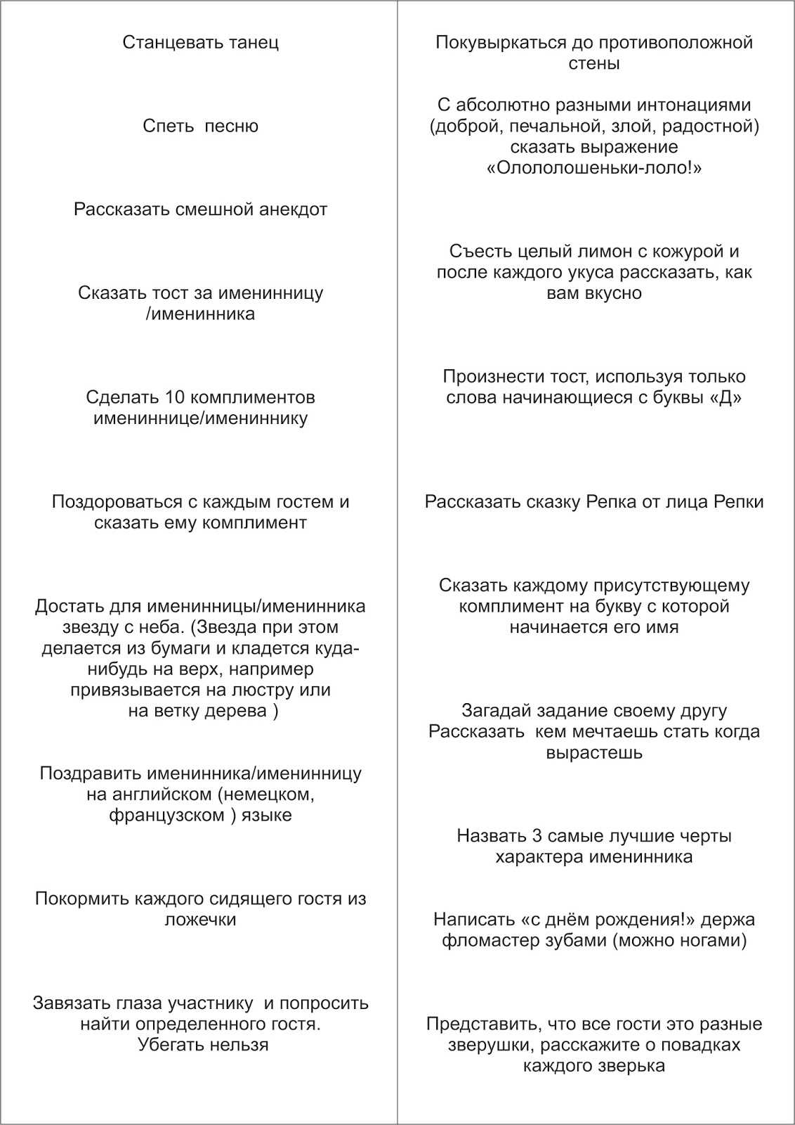 Также можно заставить гостя говорить томным женским голоском, танцевать, заикаться или сесть на шпагат, произнося поздравление. Фантазировать можно в любом направлении.