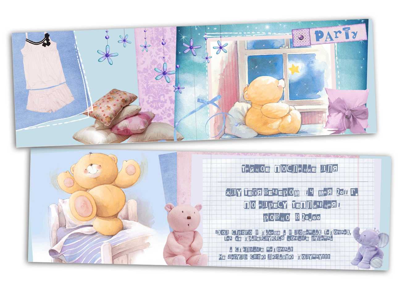 В приглашении не забудьте указать тип вечеринки, место – скорее всего пижамная вечеринка будет проходить дома, дату и время проведения и особые условия, если они конечно есть.