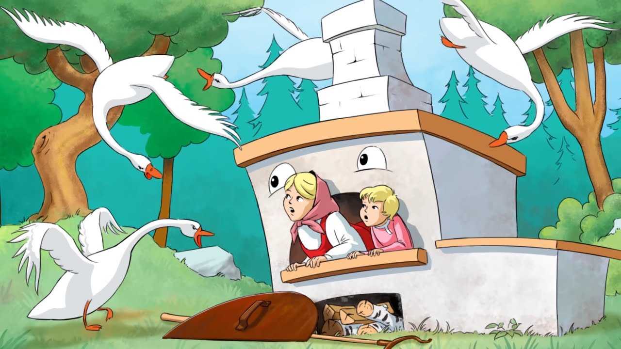 | Растопыривают руки-крылья и летят домой в гусятник | Рычит и пытается их поймать |