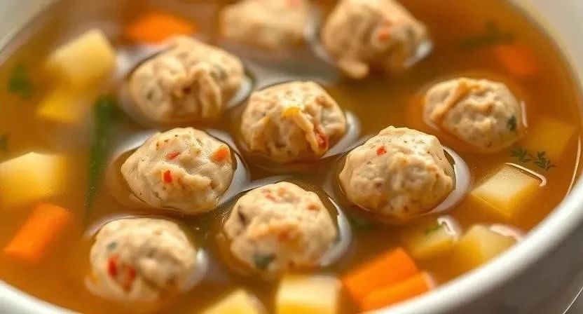 Ингредиенты: картофель — 2 шт., морковь — 1 шт., лук — 1/2 шт., фарш (говядина/курица) — 150 г, рис — 2 ст.л., вода — 1,5 л. Время приготовления: 40 минут. Калорийность: 200 ккал. Сложность: Легко.