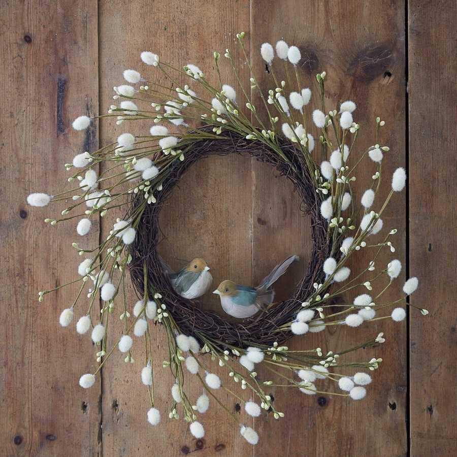 Очень модно украшать дома к Вербному воскресенью или Пасхе, поэтому попробуйте сделать вот такой красивый венок из обычных веток вербы. Чтобы поделка смотрелась красиво и изысканно, приобретите 2 декоративных птички, чтобы усадить их на ваш венок.
