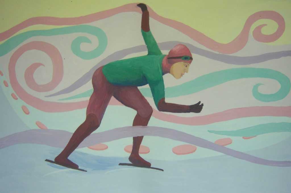 Подкорректируем работу. Мягким карандашом сделаем очертания фигуры конькобежца более объемными естественными и плавными. Штриховкой отметим складки одежды на сгибах рук и ног. Ластиком удалим лишние штрихи и вспомогательные оси. Раскрасим рисунок.