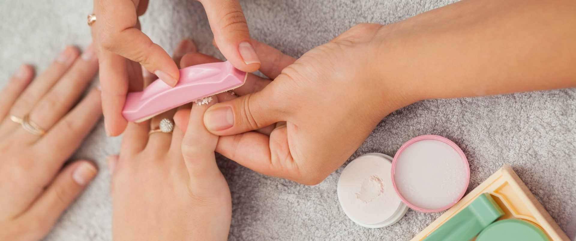 3. Если на ногтях имеются отслойки, аккуратно удаляем их пилочкой-шлифовщиком.