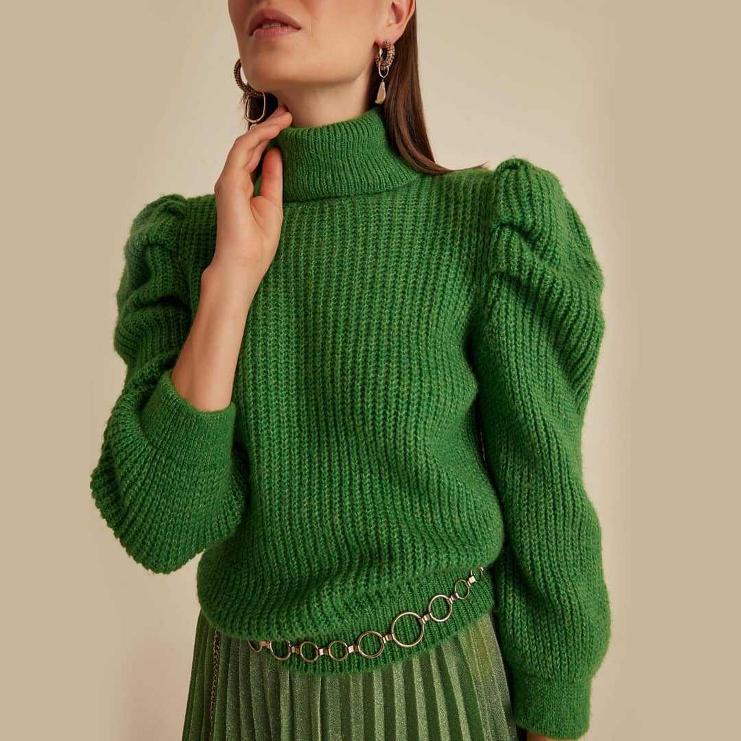 Чтобы сделать комплект интереснее и фактурнее, достаточно выбрать свитер с рукавами буфами или аккуратными фонариками. Это более удобный вариант, так как плотная ткань действительно согреет в холодную погоду, даже если носить вещь осенью без верхней одежды. Это та изюминка, ради которой не придется жертвовать комфортом и теплом.