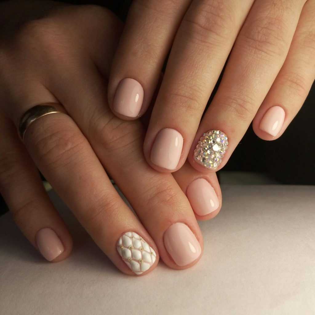 Модная и лаконичная клетка, украшенная стразинками, от которой веет шармом знаменитой Коко Шанель. Лаконичный, но объемный маникюр выполняется обычным гель лаком. Цвета чаще всего используются камуфляжные, начиная от светло-бежевого и заканчивая темно-розовым. Подойдет любой полупрозрачный лак, необходимо, чтобы он смог придать оттенок ногтевой пластине. Не стоит покрывать этим дизайном все ногти сразу. Достаточно 1-2 пальчика на каждой руке. Для прорисовки подойдет гель-краска или густой гель-лак.