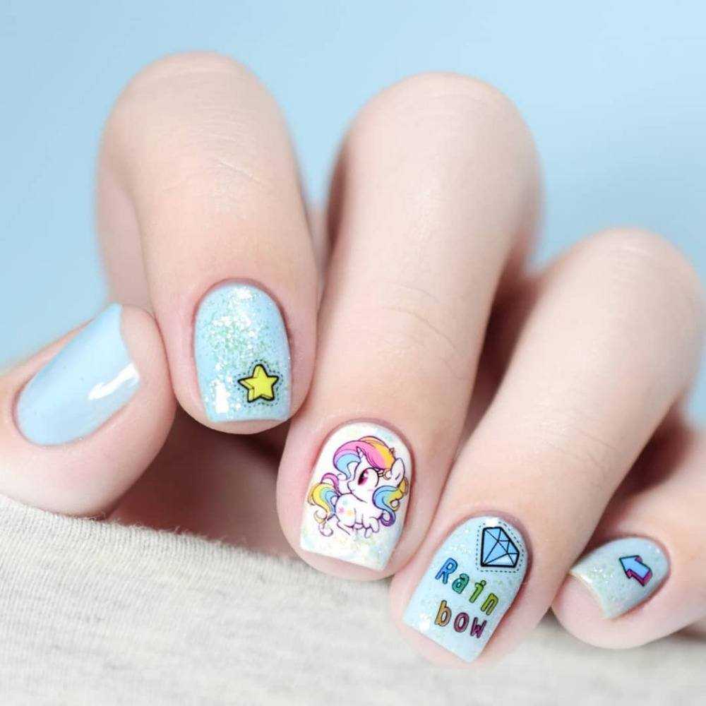 Слайдеры – пожалуй, единственный вариант для создания яркого дизайна с единорогом. Рисунок далеко не простой, поэтому нарисовать его самостоятельно не всегда получается. Обязательно пополните свой маникюрный набор слайдерами с самыми различными рисунками, они выручат вас в любом нейл-арте.
