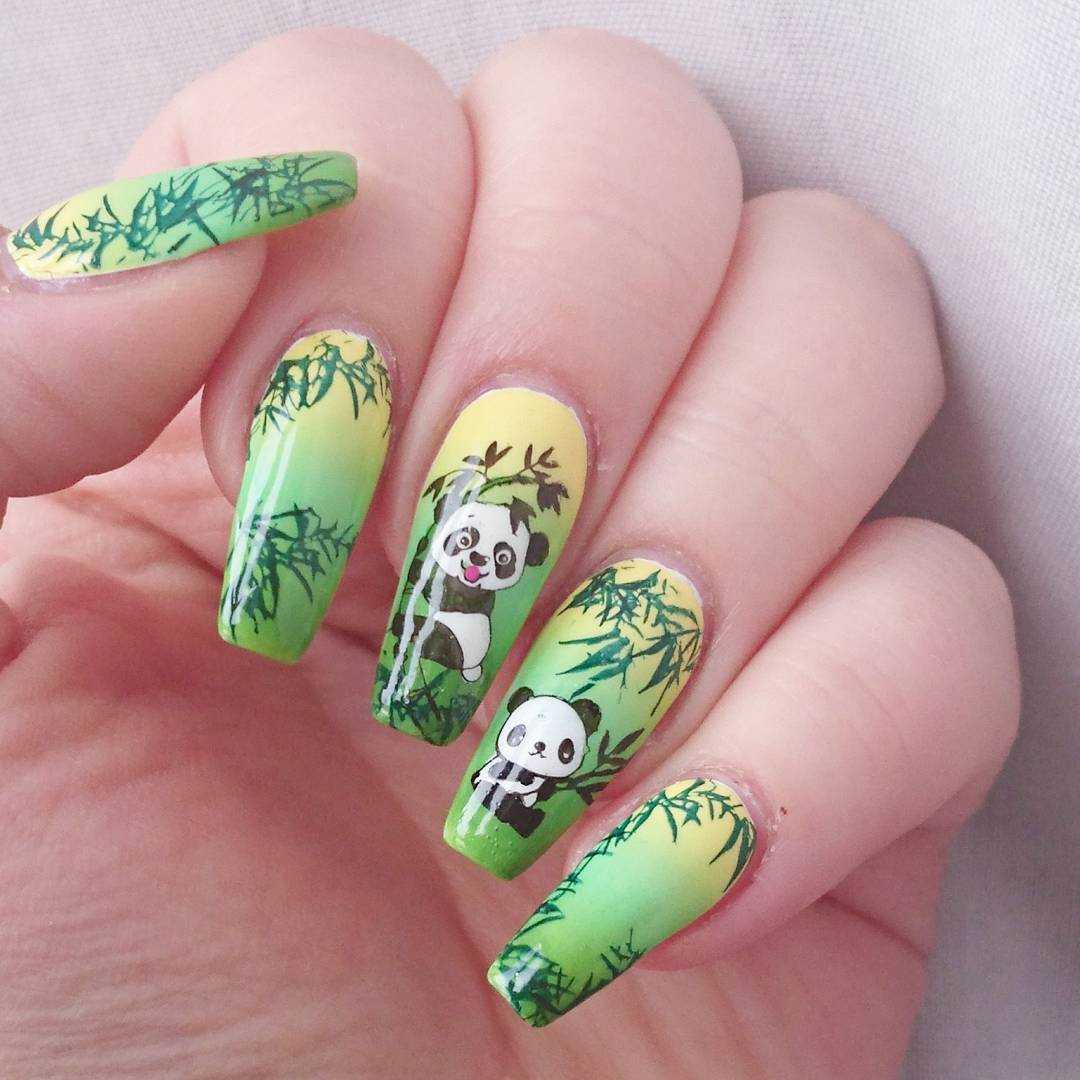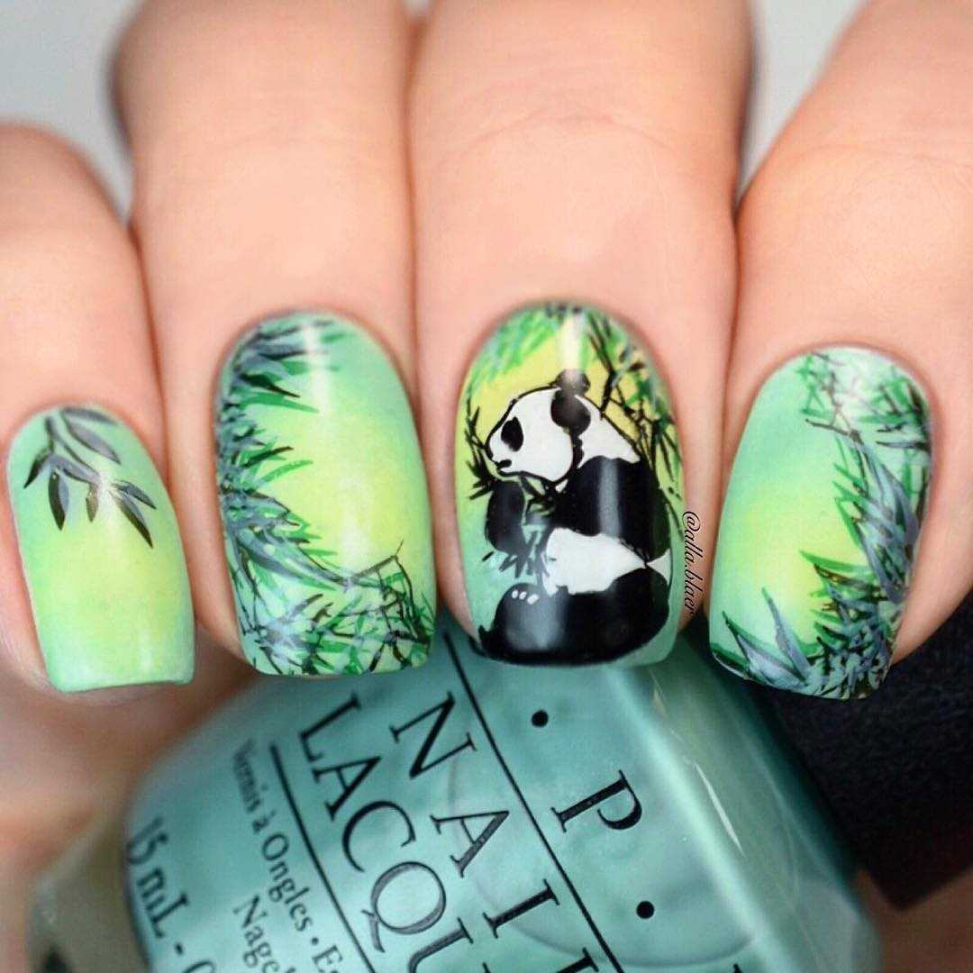 Шикарно смотрится маникюр, где изображение бамбука выполнено на слайдерах. Такой узор смотрится объемно и ярко. На слайдер можно нанести изображение панды с помощью стемпинга или ручной росписи.