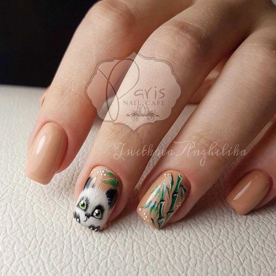 Панды – одни из самых популярных рисунков в нейл-арте. Они великолепно смотрятся на нейтральном покрытии в сочетании с сочными зелеными элементами.