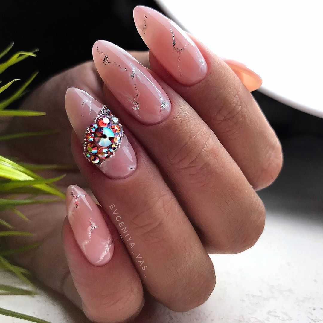 Идеи бежевого нейл-арта со стразами для длинных ноготков