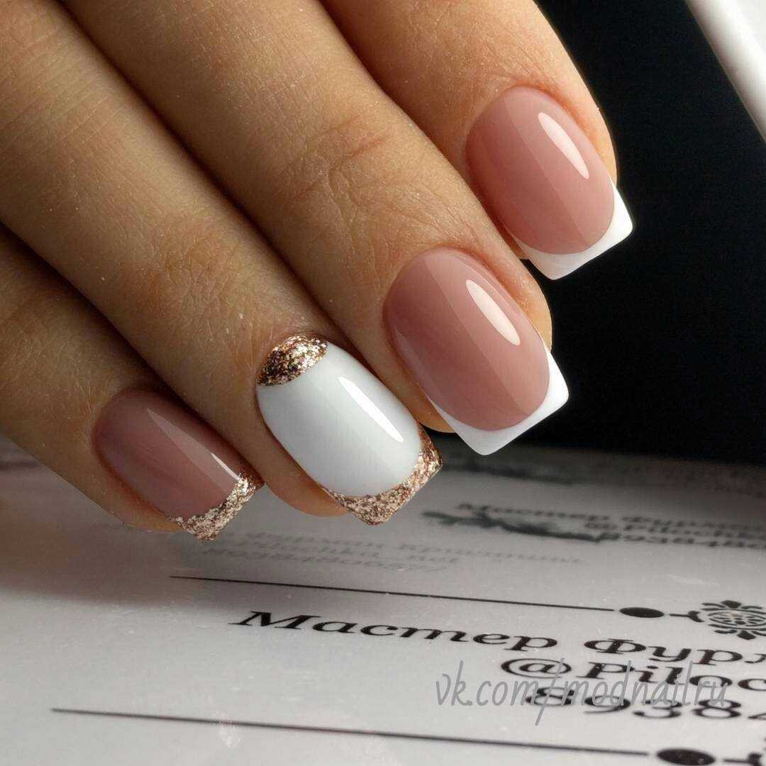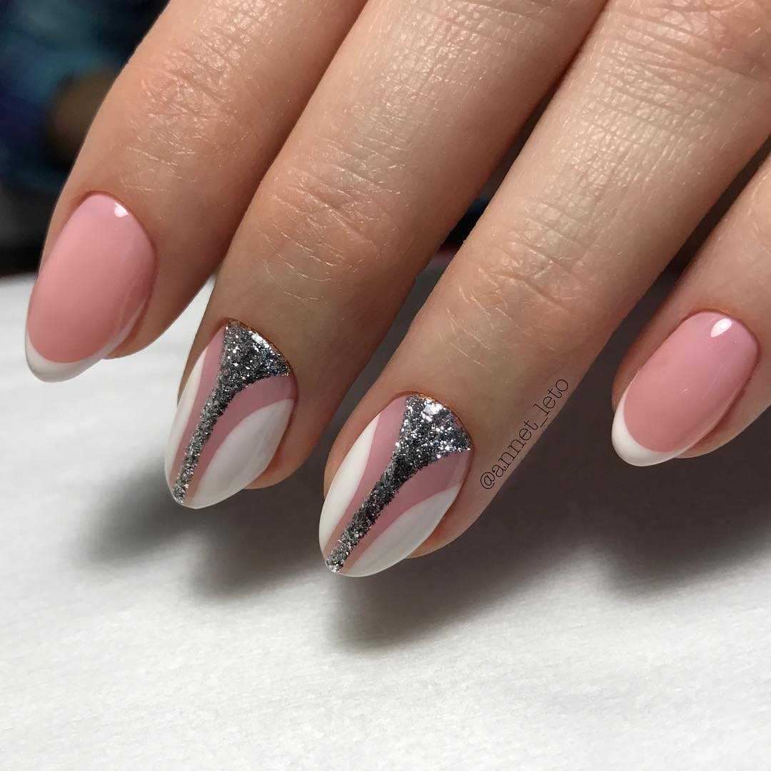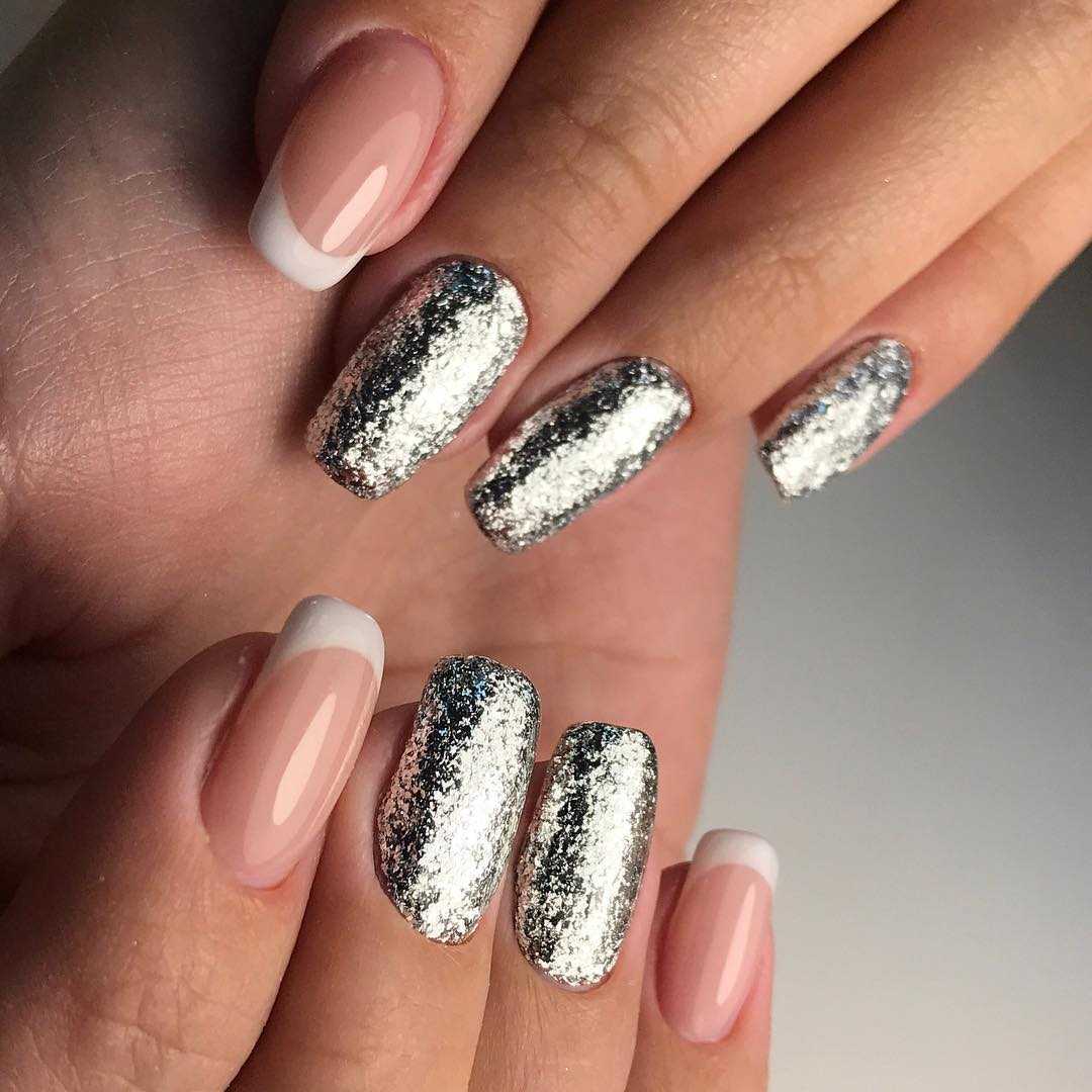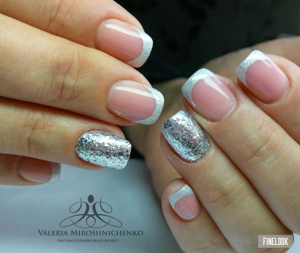 Любительницы оригинального подхода смешивают несколько техник, как френч и омбре, плавно распределяя блестки на одном из ногтей. Также совмещают французский маникюр с блестками, но используют не форму дуги, а треугольную.