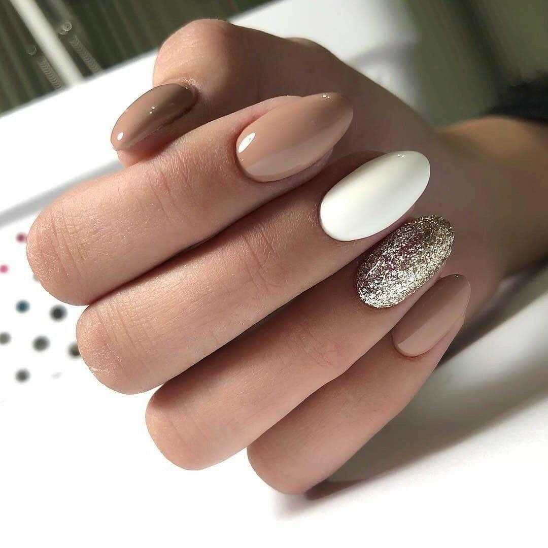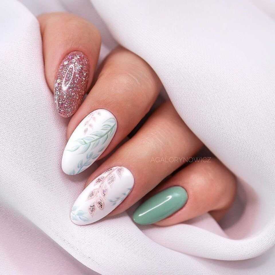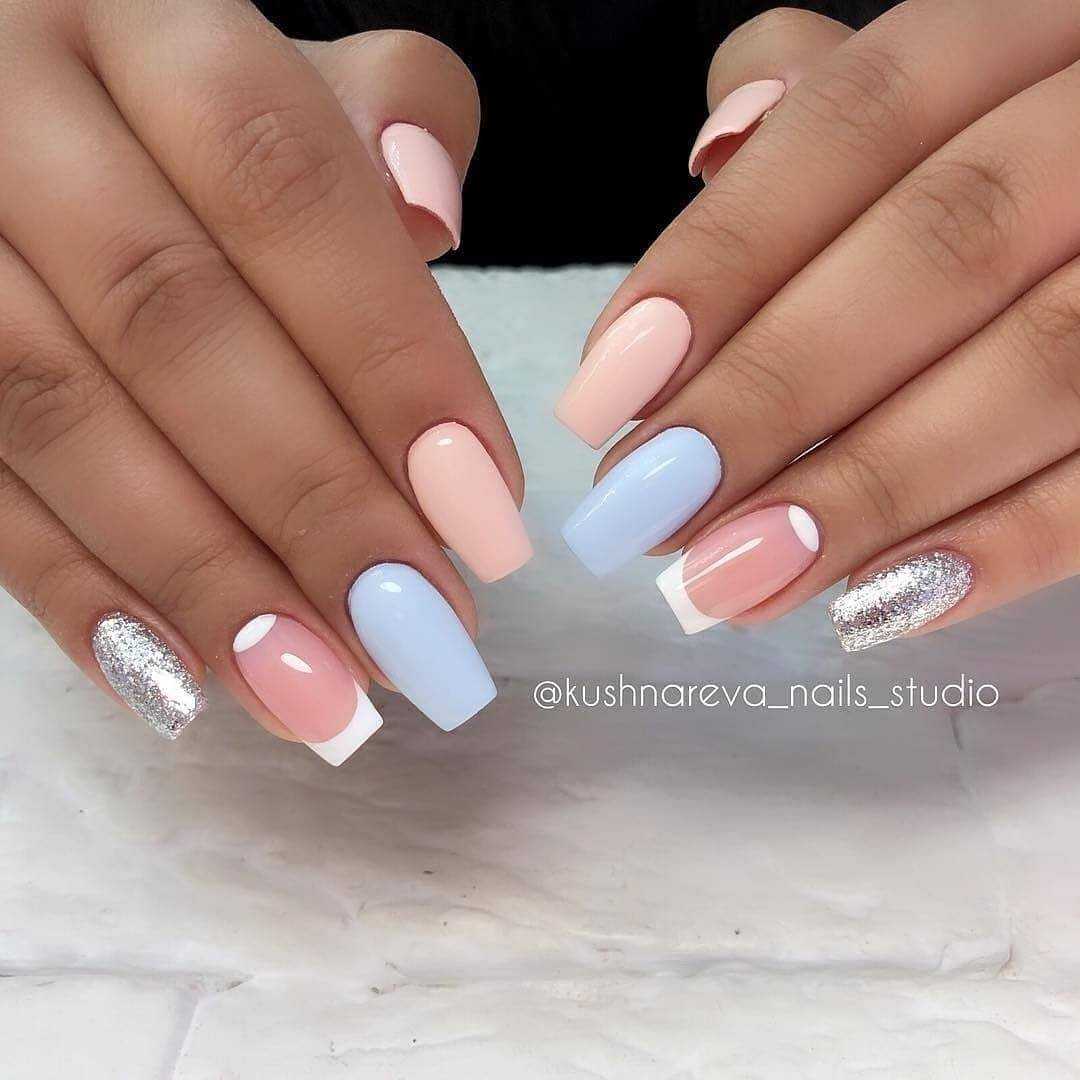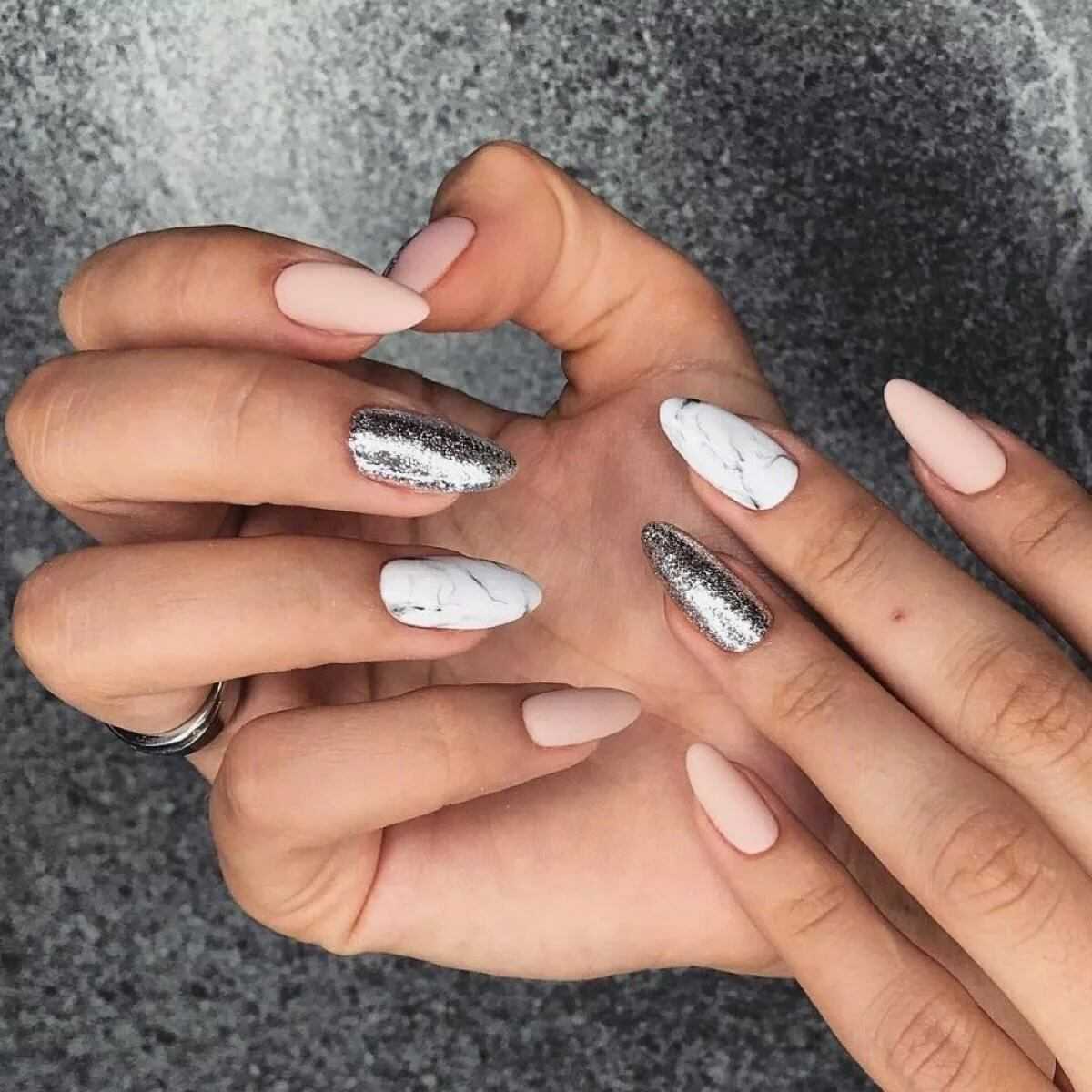 Любительницы оригинального подхода смешивают несколько техник, как френч и омбре, плавно распределяя блестки на одном из ногтей. Также совмещают французский маникюр с блестками, но используют не форму дуги, а треугольную.