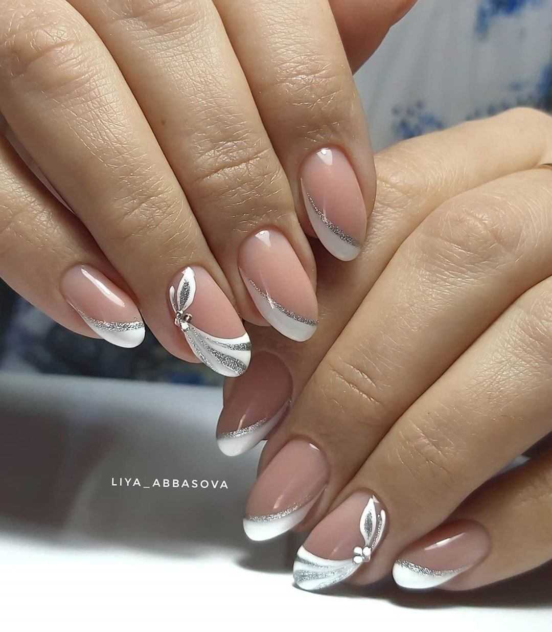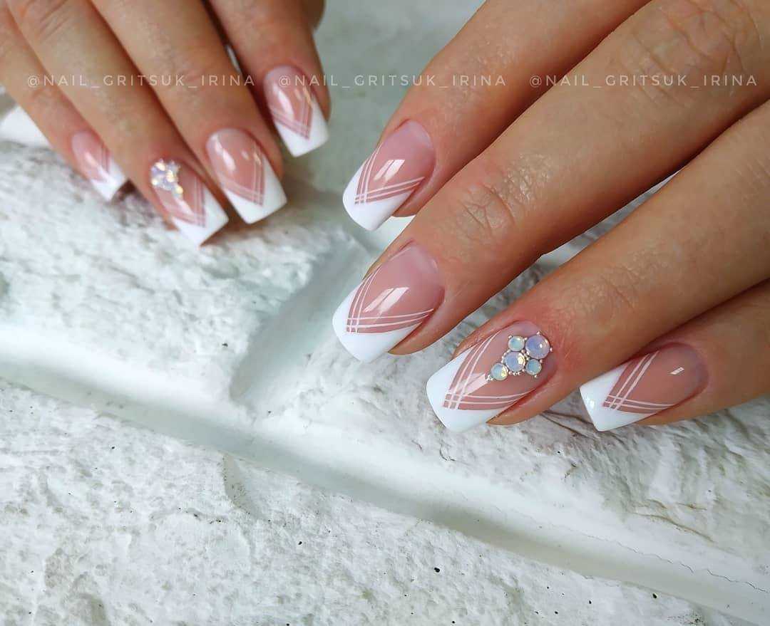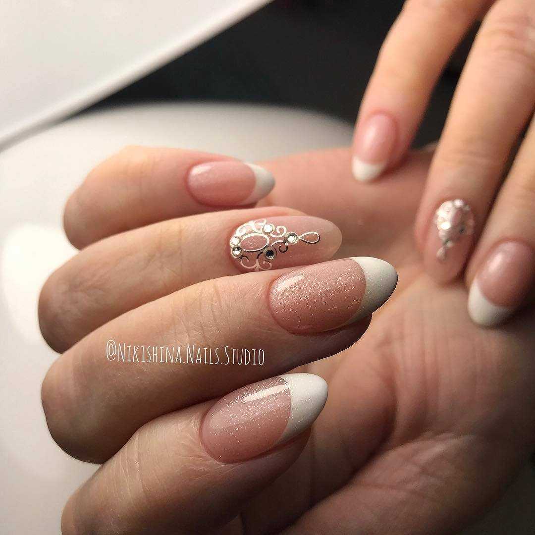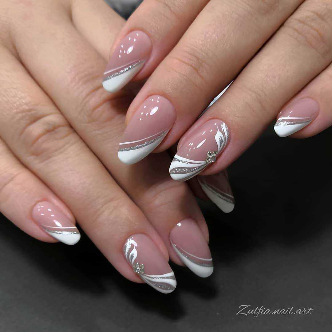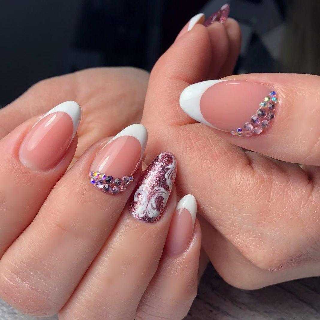 Великолепно смотрится градиентный бело-розовый маникюр, в котором один из ноготков выделен глиттером, мелкими прозрачными бульонками и стразами. Присмотритесь к классическому французскому маникюру, в создании которого как раз участвуют эти оттенки. Блестки при этом можно использовать для выделения края ногтя или отвести под блестящий декор какой-нибудь из ноготков.