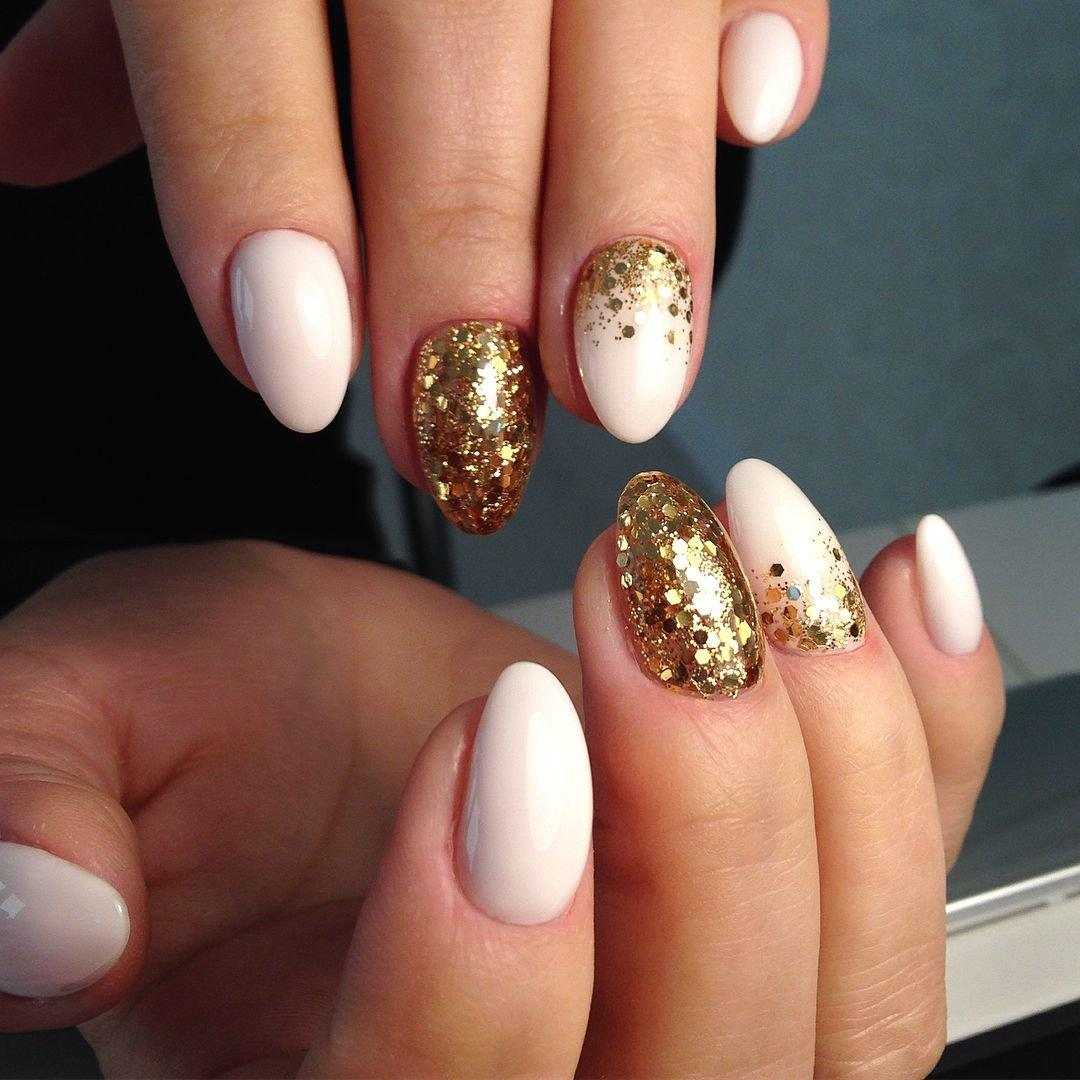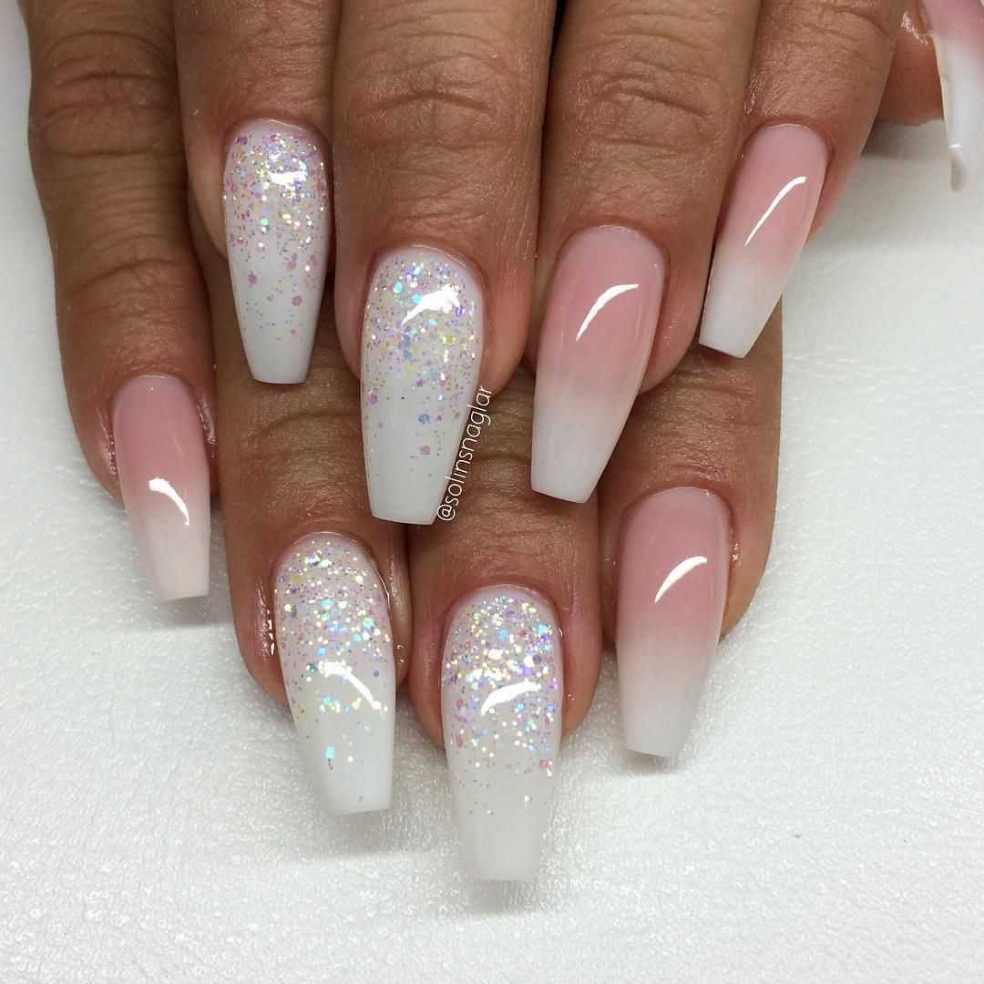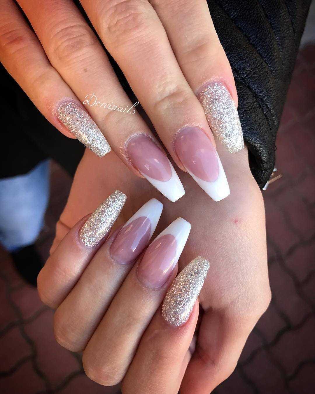 Этот популярный, стильный и красивый прием никогда не утратит своей популярности в сфере нейл-арт индустрии. Известные и модные тенденции делятся на два типа – эффект градиента белого цвета с плавным переходом в блестки, а также растягивание сверкающих блесток на ногтевой пластине, покрытой белым тоном. При этом в любом из вариантов можно использовать блестки разного цвета и формы. Омбре, выполненное при использовании блесток, очень хорошо сочетается с отдельными длинными и острыми ноготками, покрытыми полностью сверкающим декором.
