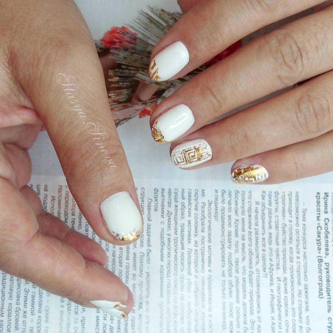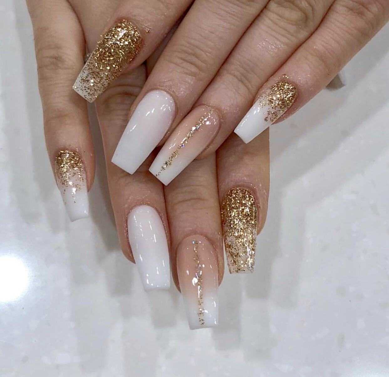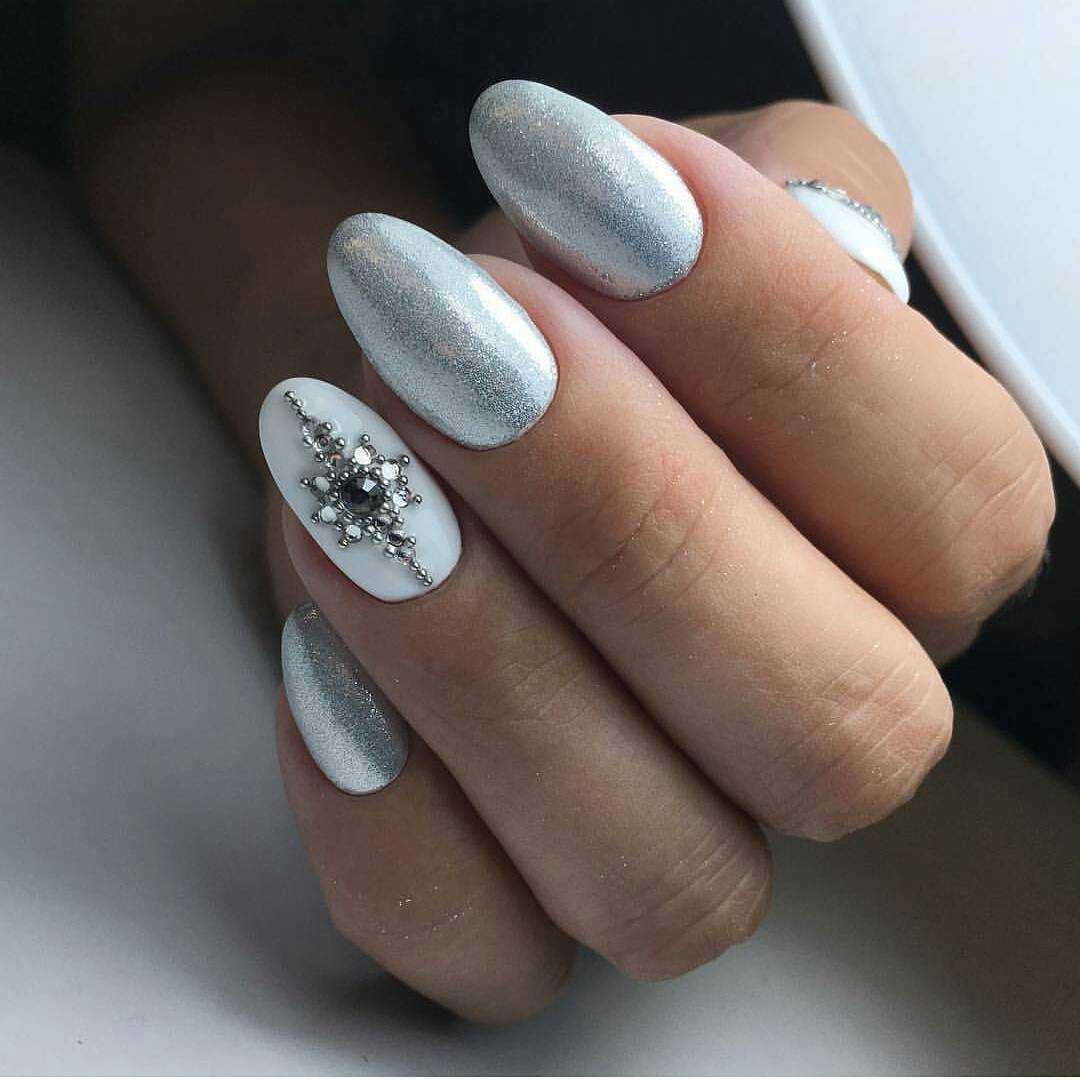 Этот популярный, стильный и красивый прием никогда не утратит своей популярности в сфере нейл-арт индустрии. Известные и модные тенденции делятся на два типа – эффект градиента белого цвета с плавным переходом в блестки, а также растягивание сверкающих блесток на ногтевой пластине, покрытой белым тоном. При этом в любом из вариантов можно использовать блестки разного цвета и формы. Омбре, выполненное при использовании блесток, очень хорошо сочетается с отдельными длинными и острыми ноготками, покрытыми полностью сверкающим декором.