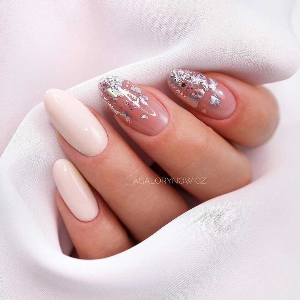 Способ растяжения блесток по длине ногтя подойдет как для праздничного варианта, так и для нейтрального повседневного дизайна маникюра. Для создания такого декора мастера маникюра используют глиттеры с разным размером блесток. За основу берут любой цвет лака, но больше всего подходят кремовые и нежные цвета, они также создают нежный эффект для ежедневного варианта.