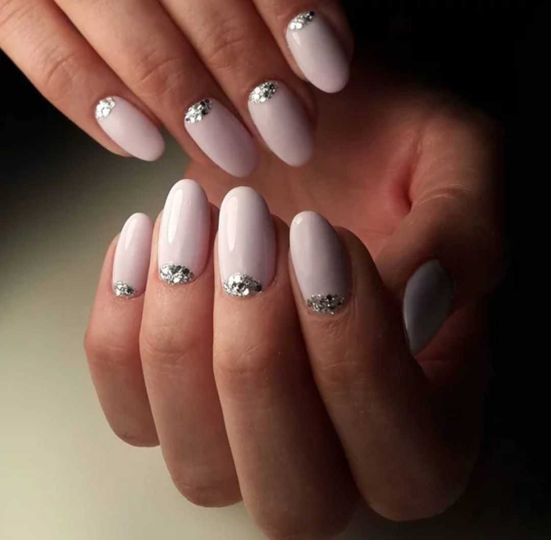 - Круглые блестинки — глиттер — разгонят грусть и разбавят аскетичность прозрачного маникюра;