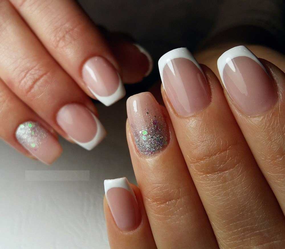 Блестки на гель-лак наносить можно в сочетании с французским маникюром, создавая изысканный образ. Классический френч разбавляют блестками вместо привычного белого покрытия, либо, заменяя им основное покрытие. Удачны варианты использования глиттера на одном из ногтей, а остальные оформляют привычным френчем.