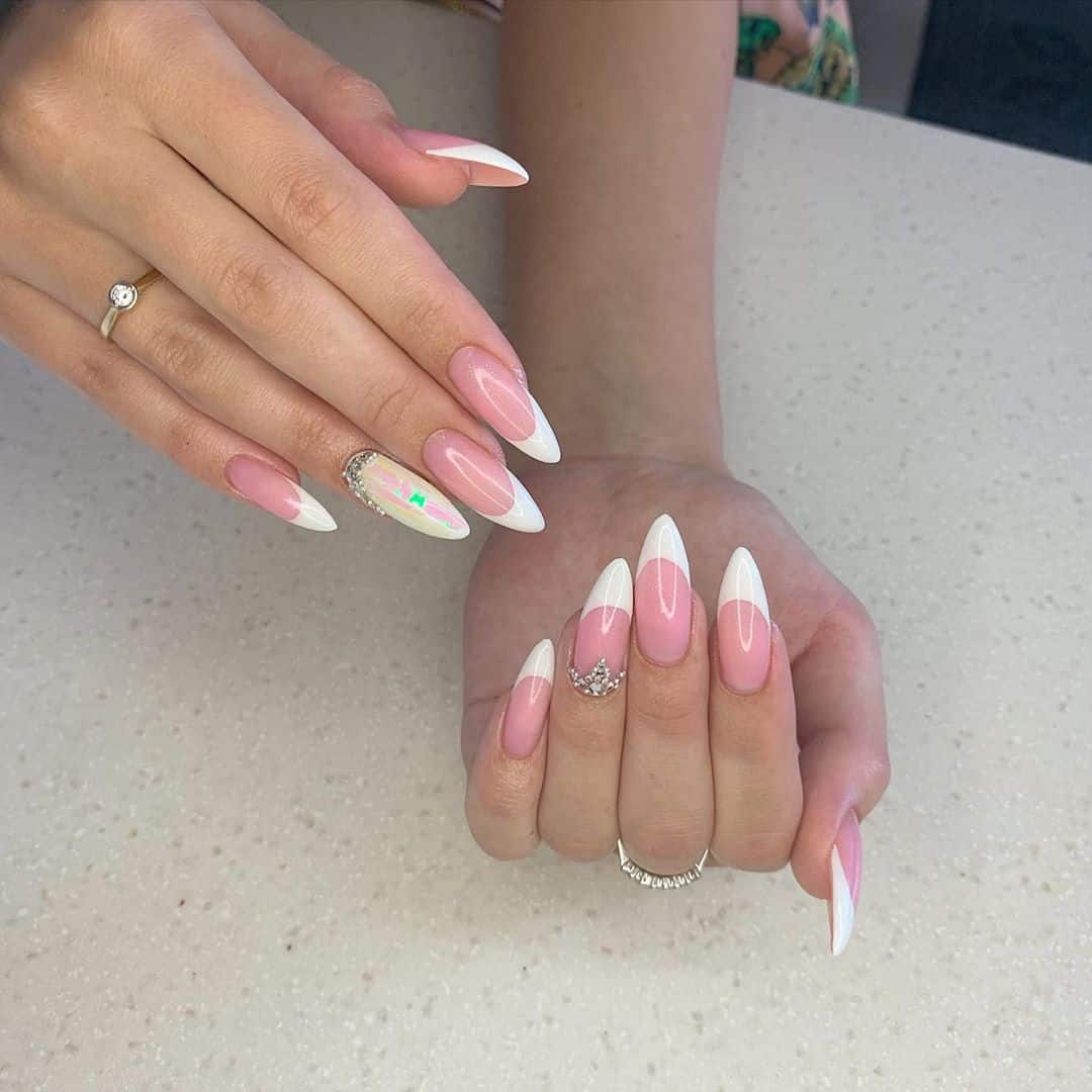 французский, или френч, когда ногтевая пластина покрывается бледно-розовым тоном лака, а на кончик ногтя в форме полумесяца наносится чистый белый цвет. Это проверенная классика, всегда элегантная и изысканная. Традиционно для свадьбы используется белый френч, но в последнее время в моду входят яркие цвета на «луне», «улыбке»;