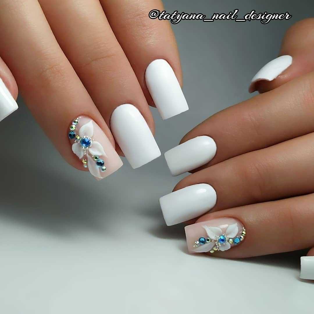 Белоснежные ноготки как нельзя лучше подходят к платью невесты и считаются классикой свадебного нейл-арта. Однако простое белое покрытие уместно только для повседневных и деловых образов, а по случаю свадьбы лучше всего дополнить маникюр ярким и сверкающим декором. Идеальными считаются серебряные или белые кристаллы.