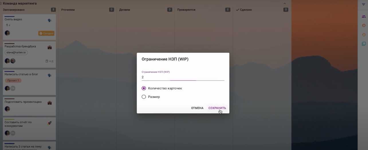 Пример установки ограничения числа незавершенных карточек