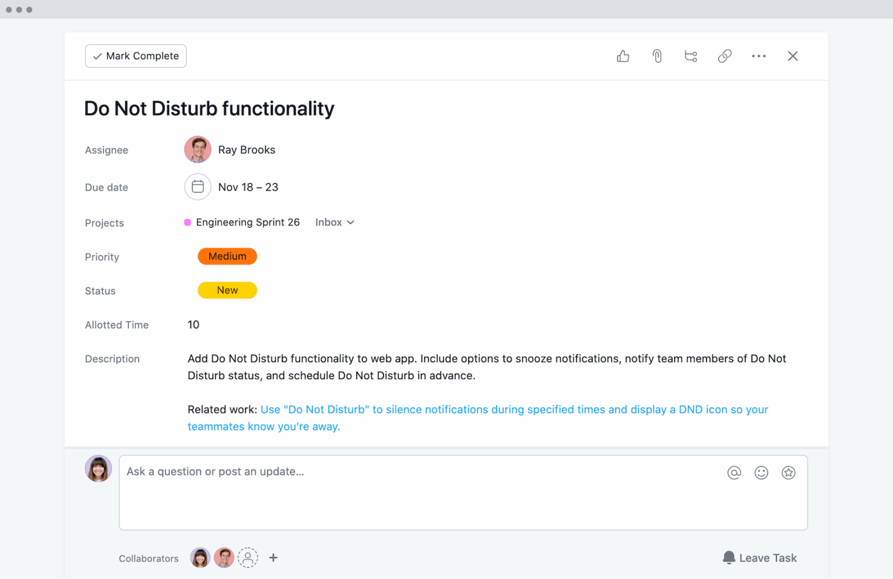 Для любой задачи можно устанавливать сроки исполнения, добавлять подзадачи, комментировать, прикреплять файлы.