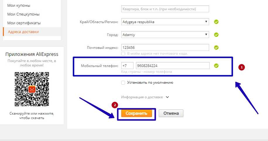 Становимся на строчку «Мобильный телефон». Полностью стираем ранее написанный номер и прописываем новый. Сохраняем по клавише «Сохранить». Теперь таможенные службы, курьер или продавец будут знать номер, по которому можно с вами связаться.
