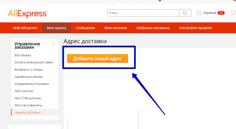 Выберите поле «Добавить новый адрес». Сюда вам будут отправляться все оплаченные заказы. В дальнейшем адрес можно корректировать или добавить дополнительный.