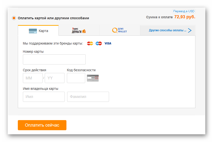 Второй способ схож с механикой оплаты банковскими картами на любой онлайн-площадке. Пользователь должен вводить данные своего платежного средства в соответствующую форму, после чего оттуда списывается нужная для оплаты сумма. Этот вариант намного быстрее и проще, не требует отдельных процедур, потому наиболее предпочтителен для пользователей, которые совершают либо разовые нечастые покупки, либо на небольшие суммы.