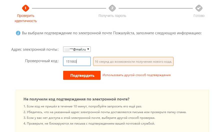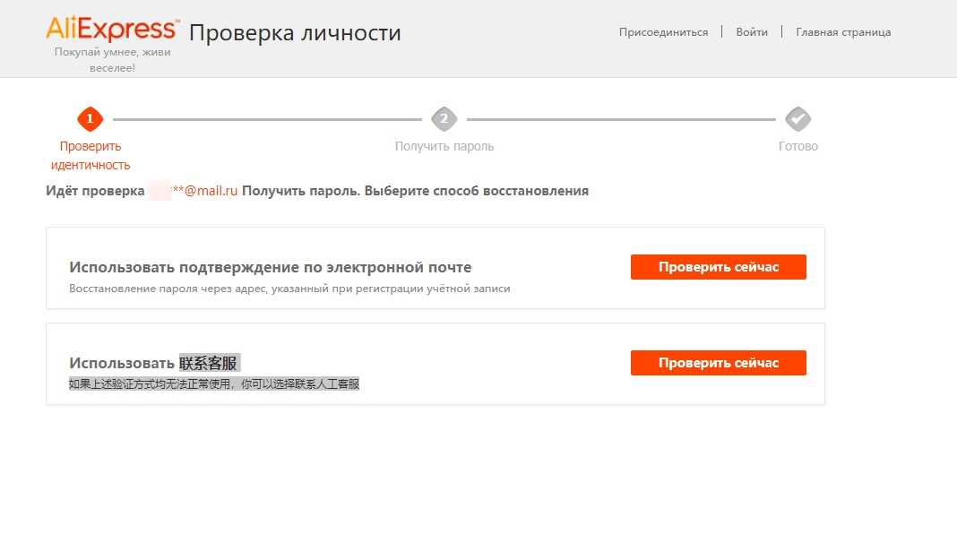 - Откроется страница идентификации личности пользователя Алиэкспресс. Выбрать подтверждение по e—mail.