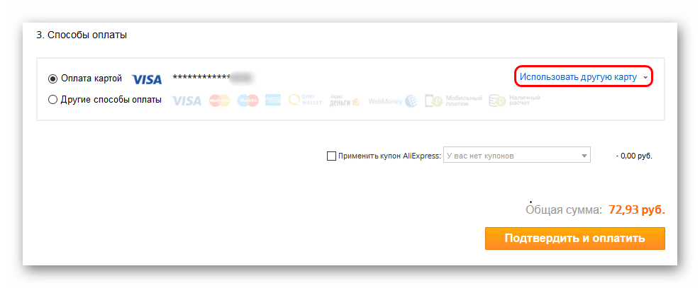 - Первый способ – это нажать на «Использовать другую карту» в пункте 3 на стадии оформления покупки.