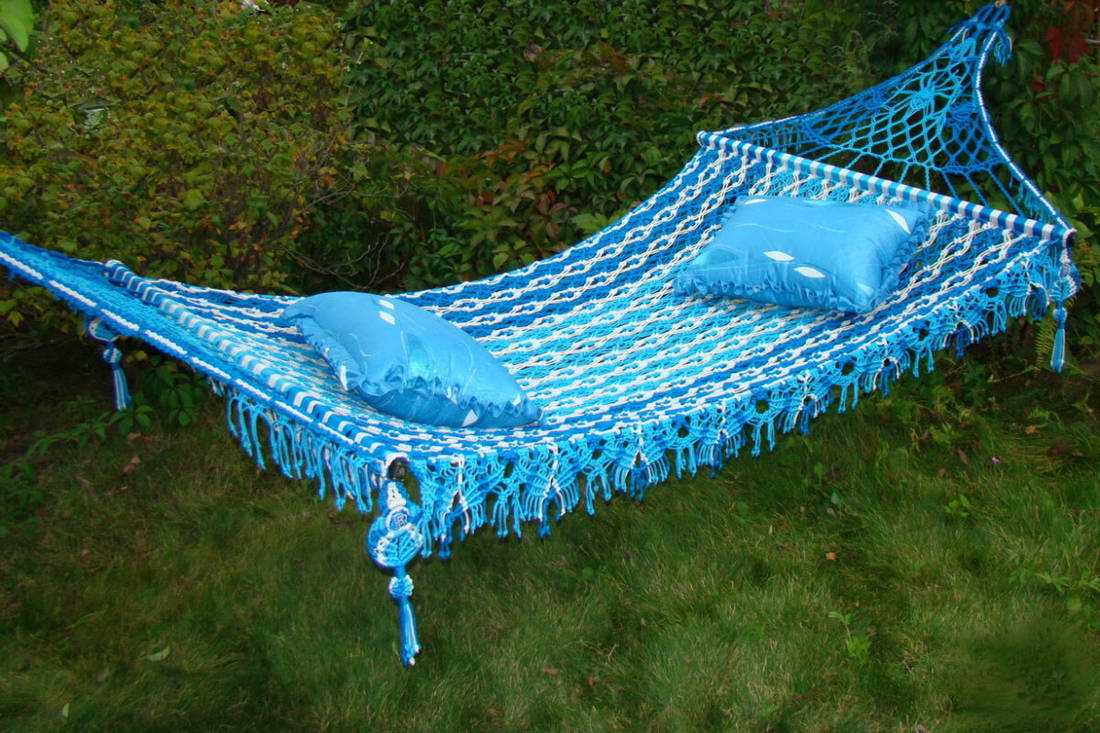 Плетеный гамак представляет собой сеть, похожую на рыболовную, изготовленную из толстой и прочной веревки или каната. В первом случае может использоваться плетение в две нити, а диаметр составляет примерно 3 см. Ячейки будут иметь форму ромба, сторона которого имеет длину от 5 до 10 см. Длина и ширина самого гамака может быть разной, они определяются в зависимости от личных предпочтений. На концах полотна обязательно есть планки, распирающие сеть, а все концы нитей собраны в жгут, на котором находится какое-нибудь крепёжное приспособление.