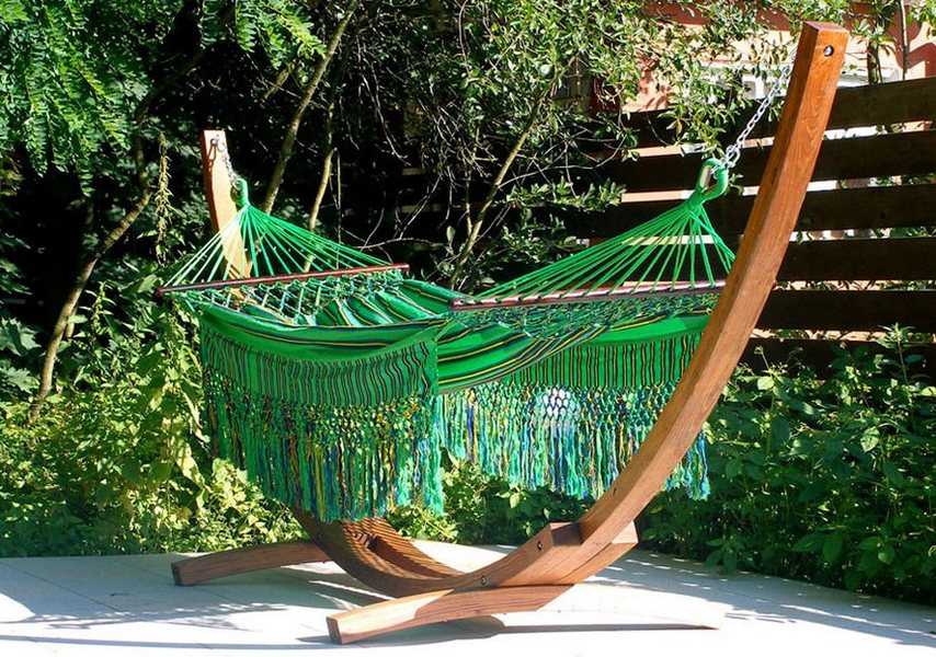 Никаких опор искать не нужно, так как гамак имеет уже готовый каркас. Последний может быть изготовлен из металла или дерева. Каркасные гамаки можно ставить где угодно, а в зависимости от особенностей конструкции они бывают: