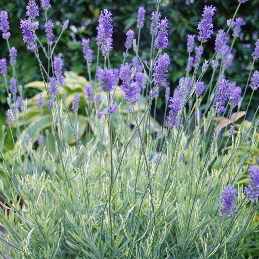 Английская лаванда в виде компактного вечнозеленого кустарника до 40 см высотой хорошо растет на солнечных местах, но выдержать морозные зимы может только под укрытием. Листки имеют серо-зеленый оттенок и кремово-белую кайму. Веточки с ароматными фиолетово-голубыми цветками могут стать чудесным подарочным букетом, а кустики – красивой живой изгородью вдоль дорожек и вокруг лужаек и клумб.
