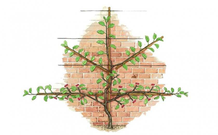 Для культивации шпалерным методом подходят только сорта на карликовом подвое, отличающиеся медленным побегообразованием, или карликовые и колоновидные виды. Дерево изначально располагается на опоре, от которой отходят в стороны шпалеры. Именно к ним закрепляют скелетные ветки.