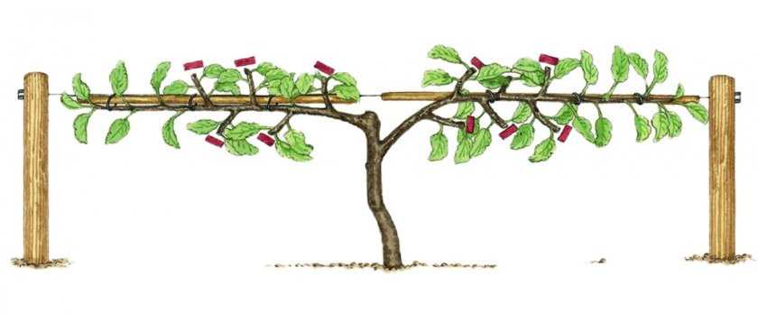 Такая формировка проще всего выполняется при высадке годовалых саженцев. Так, сразу же после посадки, штамб укорачивают до 60 см. Это простимулирует рост побегов в стороны. На второй год, в весенний период, оставляют 2 самые мощные ветки скелета, растущие в разные стороны. Их подвязывают к туго натянутой проволоке в положении 90° в отношении штамба.